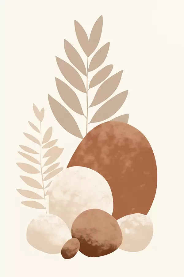 Plakát a sziklán Absztrakt formák, texturált kövek és levelek halvány barack- és terrakotta árnyalatokban, minimalista, krém színű háttérrel f47013