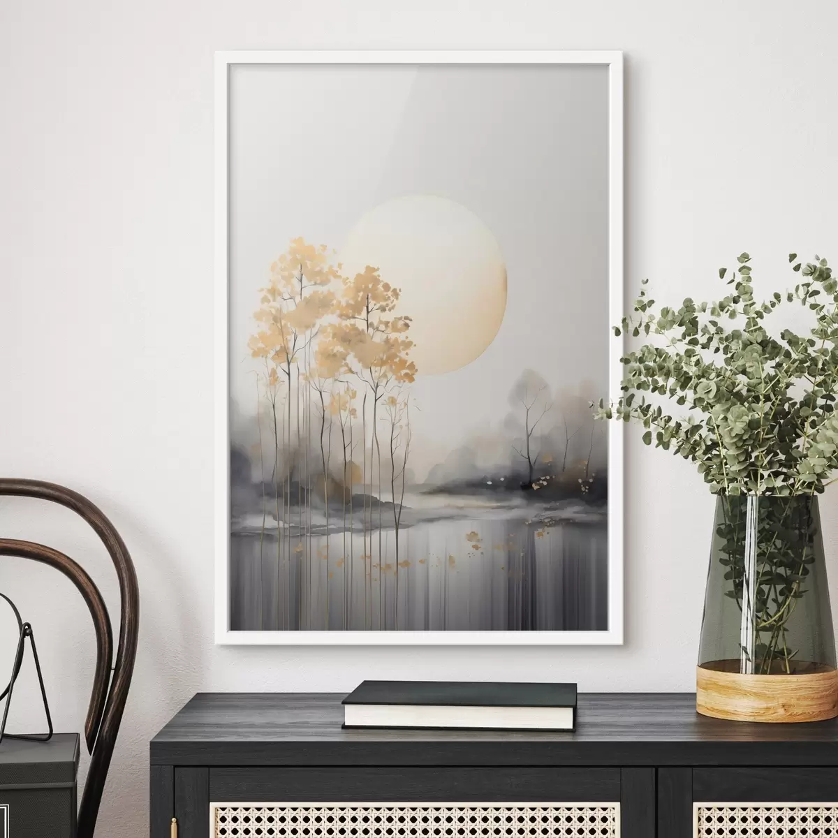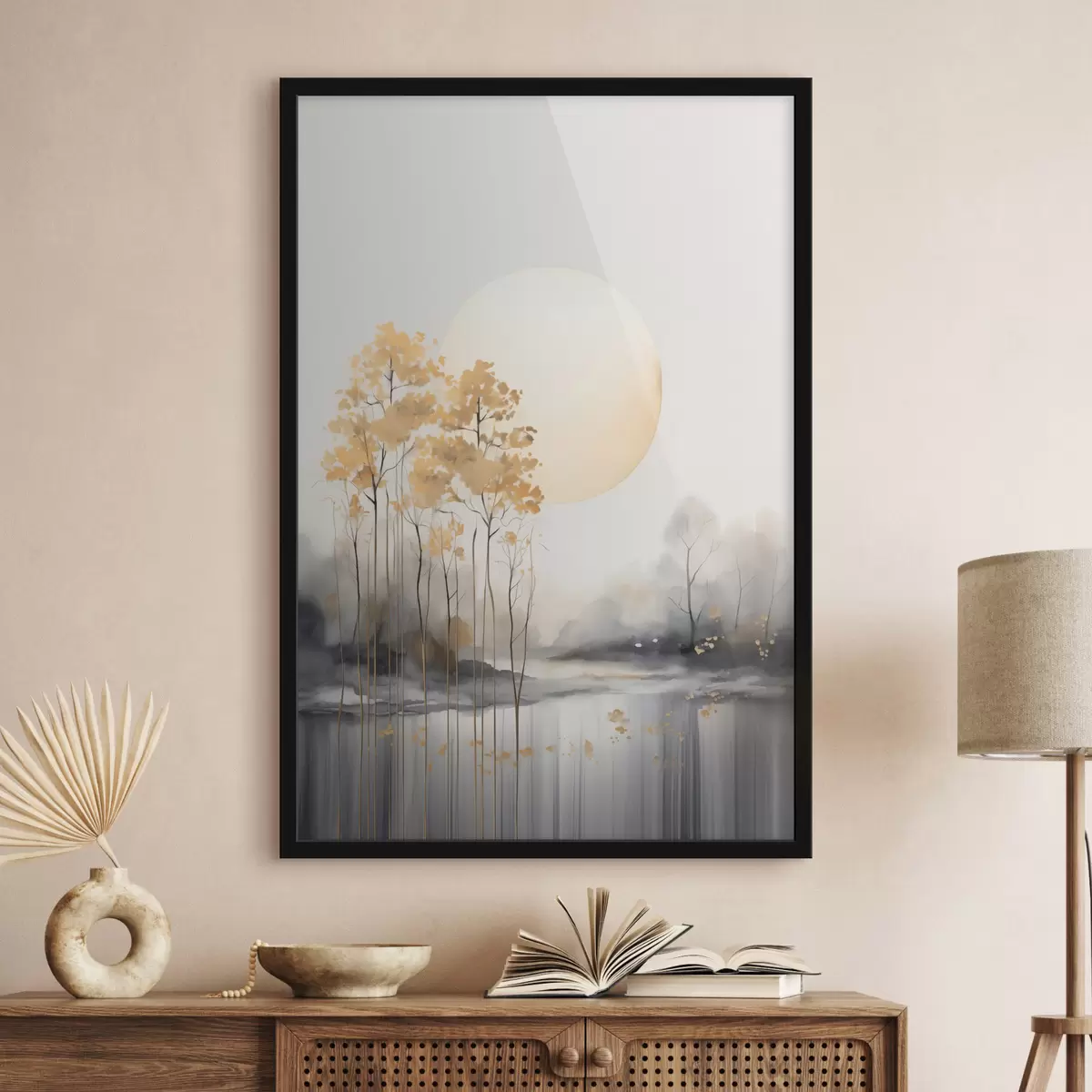 Poster Dekoratív absztrakt táj, magas fák sárga levelekkel, folyó és köd a háttérben Nr f47014
