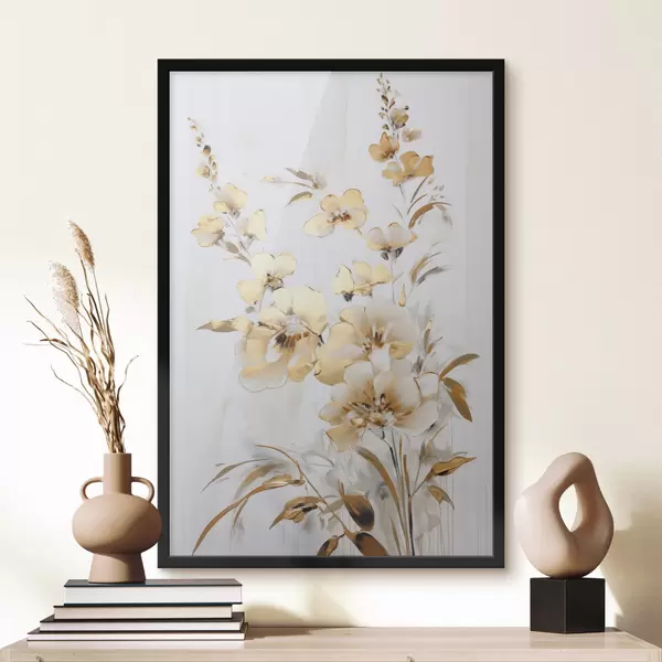Plakát a sziklán Texturált sárga virágok és levelek fehér háttér előtt, finom ecsetvonásokkal f47016