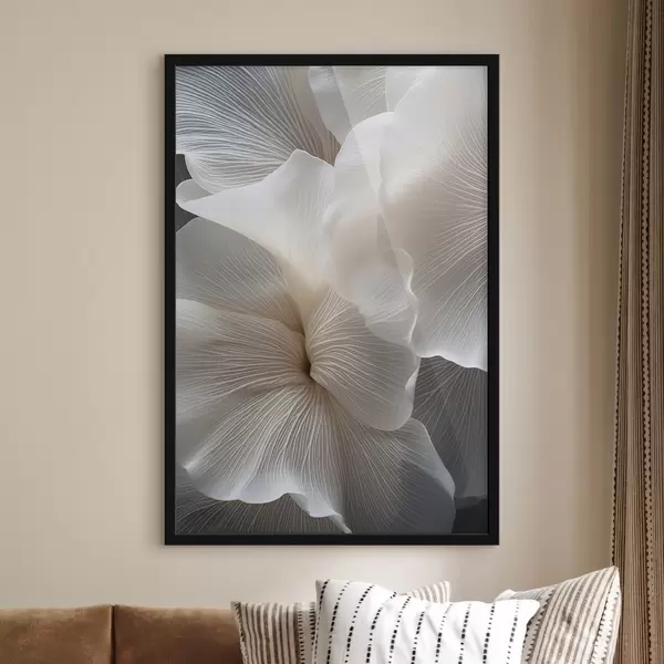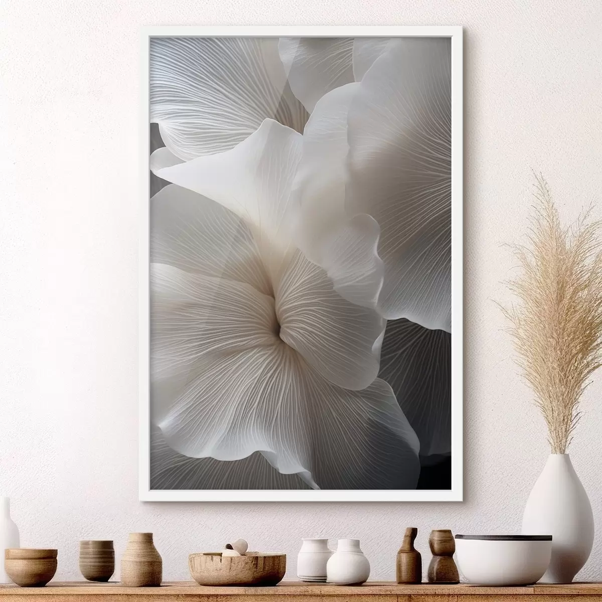 Poster Közelkép finom, absztrakt fehér virágszirmokról, bonyolult vonalakkal és elmosódott sötét háttérrel Nr f47019
