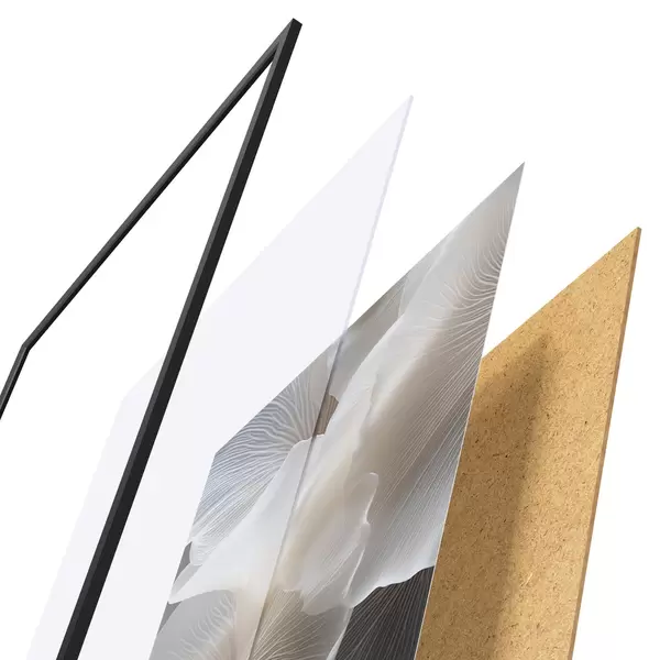 A poszter keretből, plexiből, nyomtatott képből és forgácslap hátlapból áll. A poszter a hátoldalon található rögzítőknek köszönhetően azonnal felakasztható a falra.