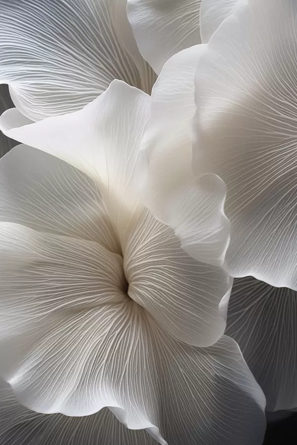 Poster Közelkép finom, absztrakt fehér virágszirmokról, bonyolult vonalakkal és elmosódott sötét háttérrel Nr f47019