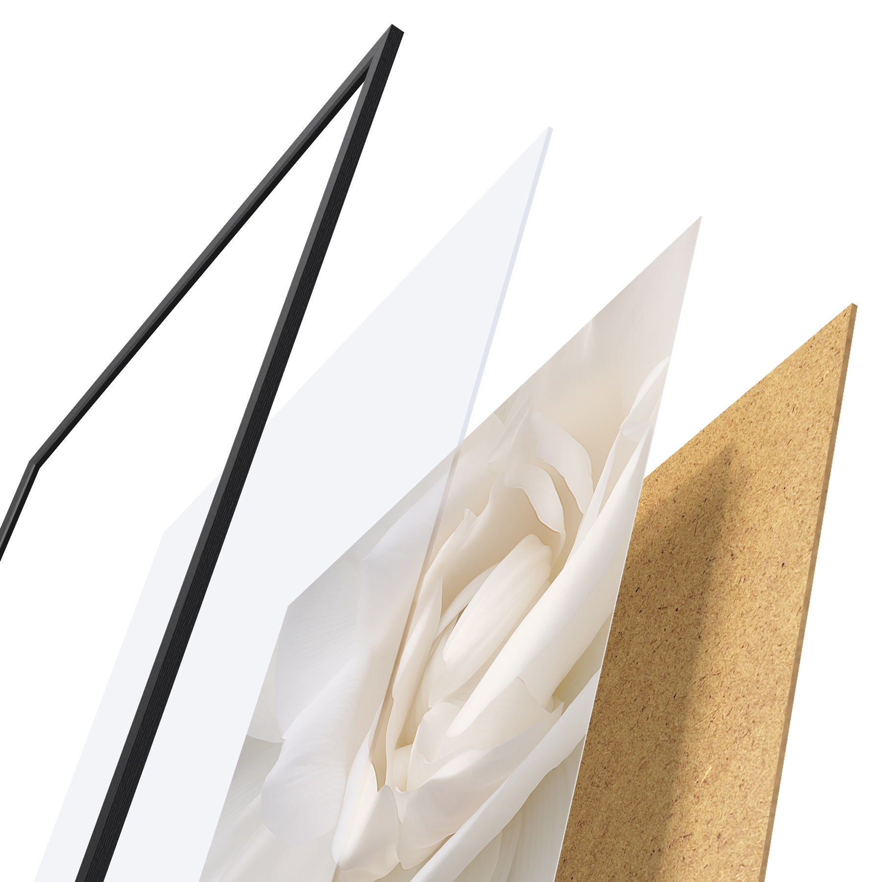 A poszter keretből, plexiből, nyomtatott képből és forgácslap hátlapból áll. A poszter a hátoldalon található rögzítőknek köszönhetően azonnal felakasztható a falra.