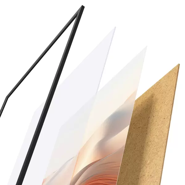 A poszter keretből, plexiből, nyomtatott képből és forgácslap hátlapból áll. A poszter a hátoldalon található rögzítőknek köszönhetően azonnal felakasztható a falra.