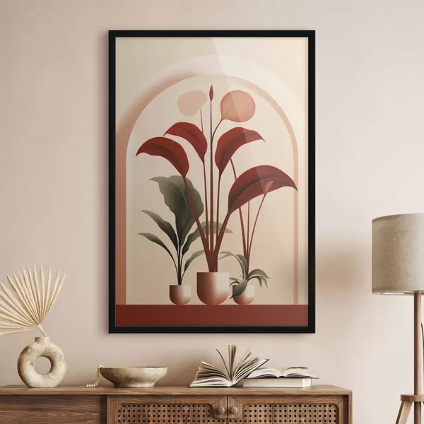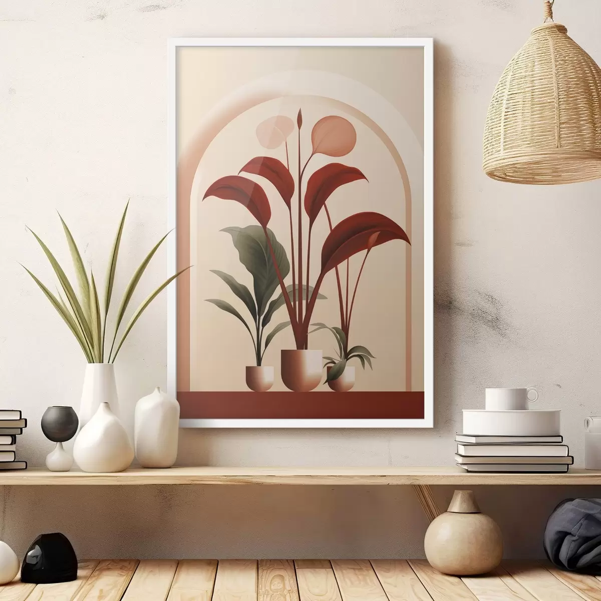 Poster Absztrakt cserepes növények nagy zöld és piros levelekkel egy krém színű boltív előtt Nr f47033