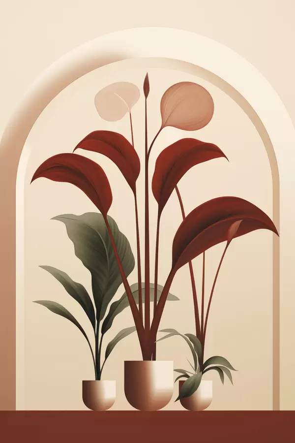 Poster Absztrakt cserepes növények nagy zöld és piros levelekkel egy krém színű boltív előtt Nr f47033