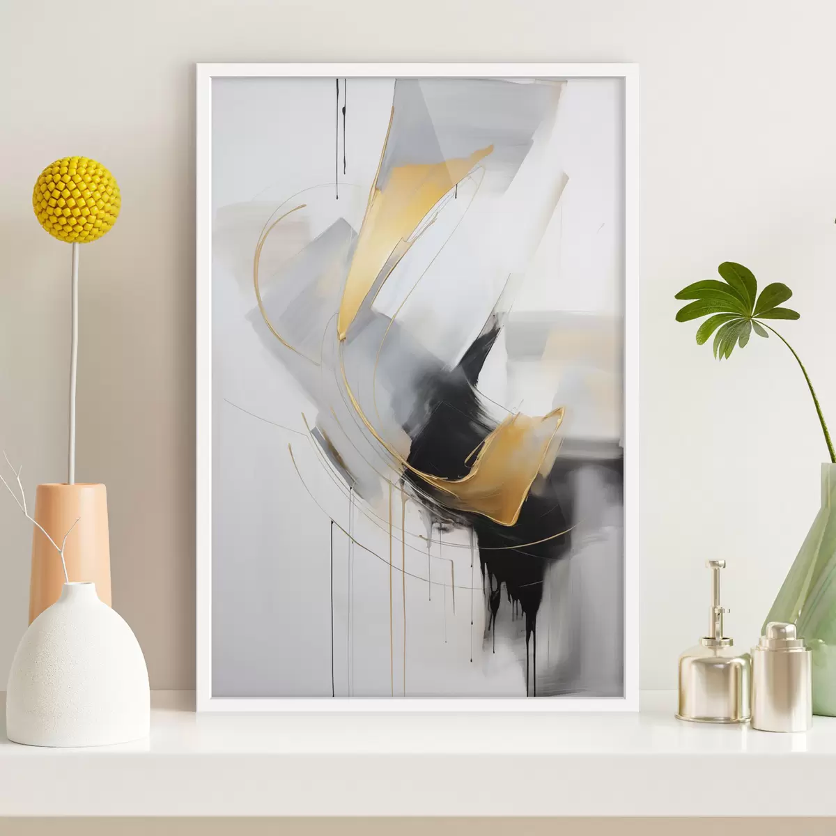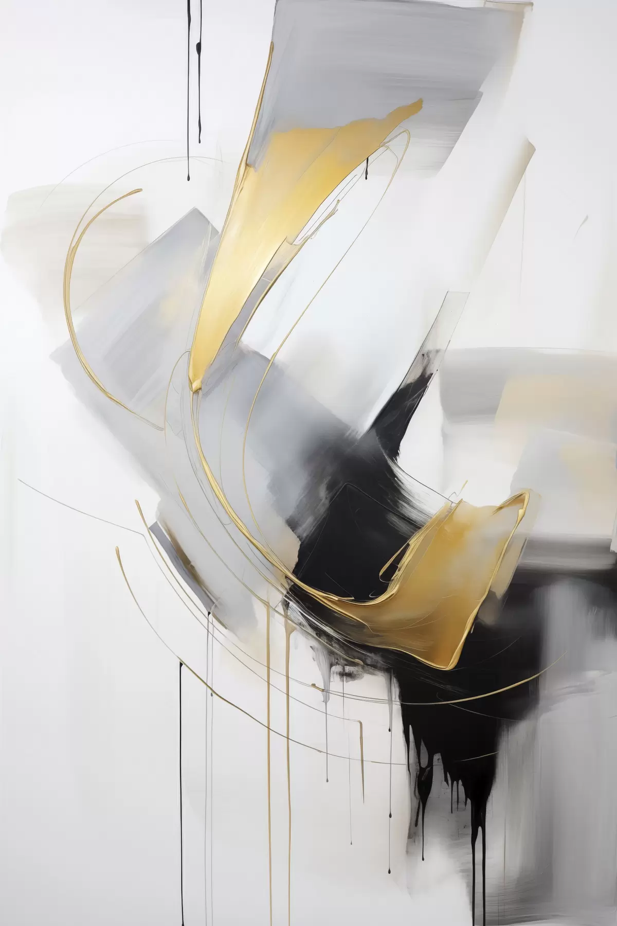 Poster Absztrakt festmény sárga, fekete és fehér ecsetvonásokkal, dinamikus vonalakkal Nr f47034