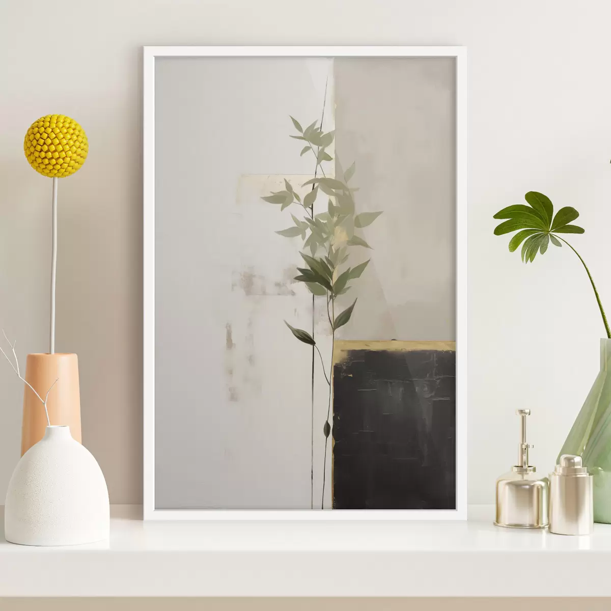 Plakát a sziklán Minimalista textúrájú festmény, amelyen egy vázát és zöld leveleket ábrázolnak absztrakt geometriai alakzatok háttérében. f47037