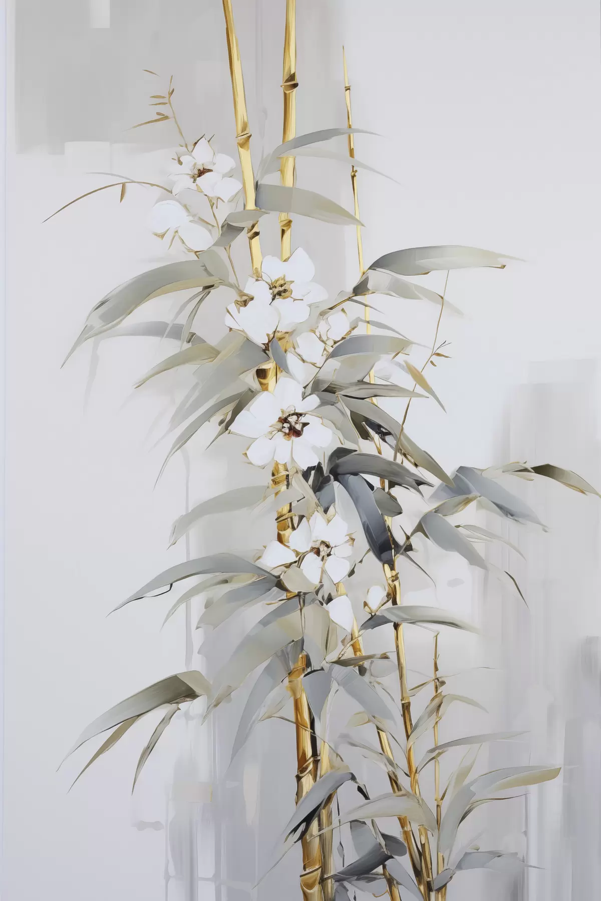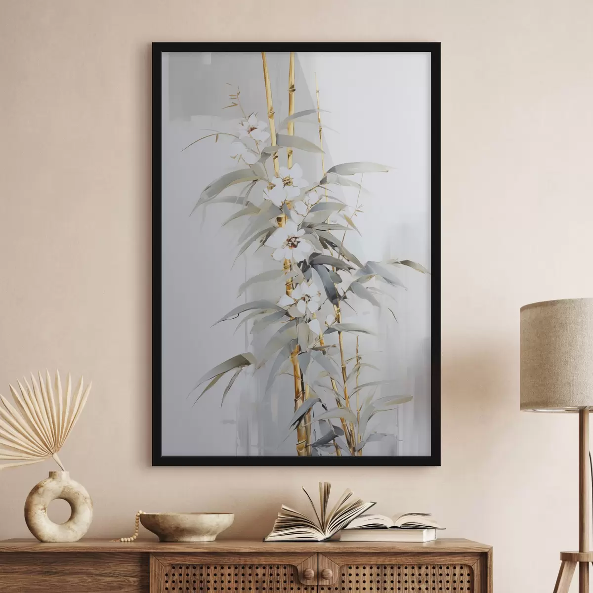 Poster Absztrakt bambuszszárak sárga akcentussal, finom fehér virágokkal és halványzöld levelekkel, szürke háttérrel Nr f47039