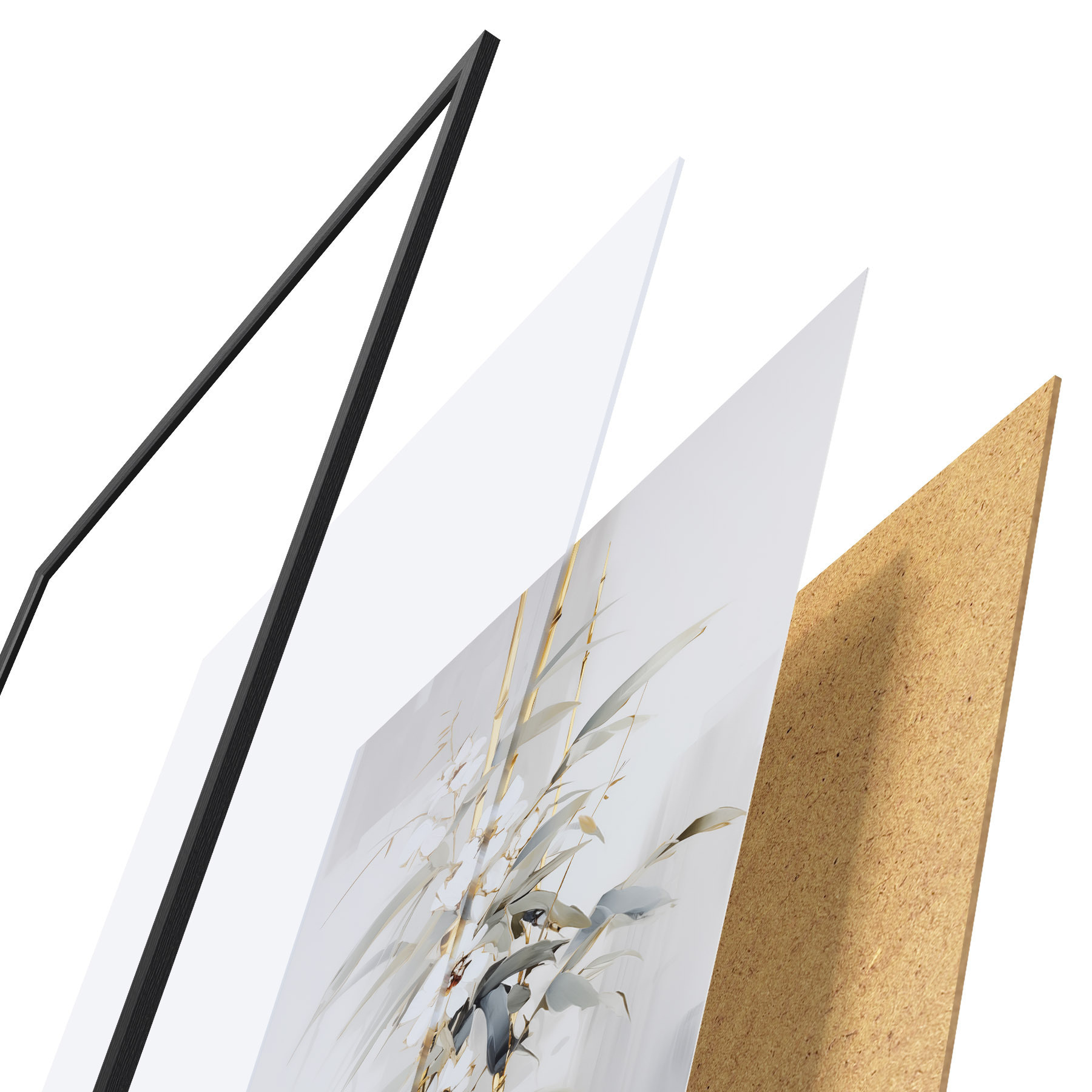 A poszter keretből, plexiből, nyomtatott képből és forgácslap hátlapból áll. A poszter a hátoldalon található rögzítőknek köszönhetően azonnal felakasztható a falra.