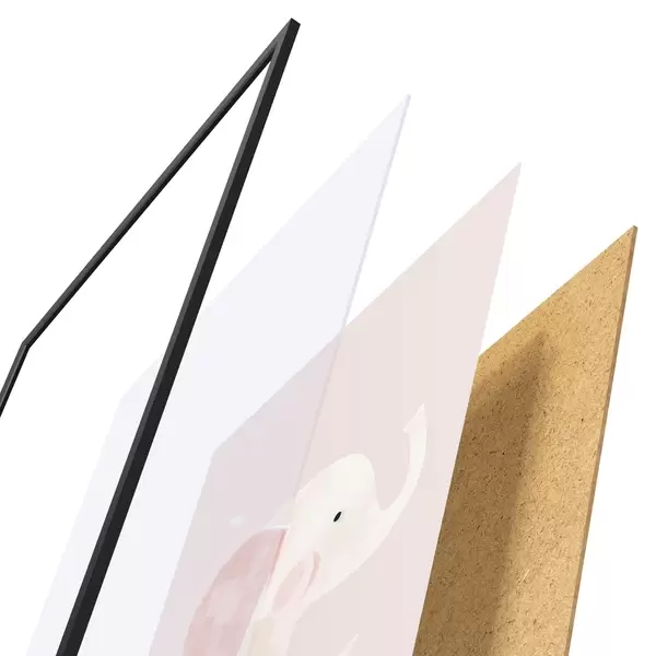 A poszter keretből, plexiből, nyomtatott képből és forgácslap hátlapból áll. A poszter a hátoldalon található rögzítőknek köszönhetően azonnal felakasztható a falra.