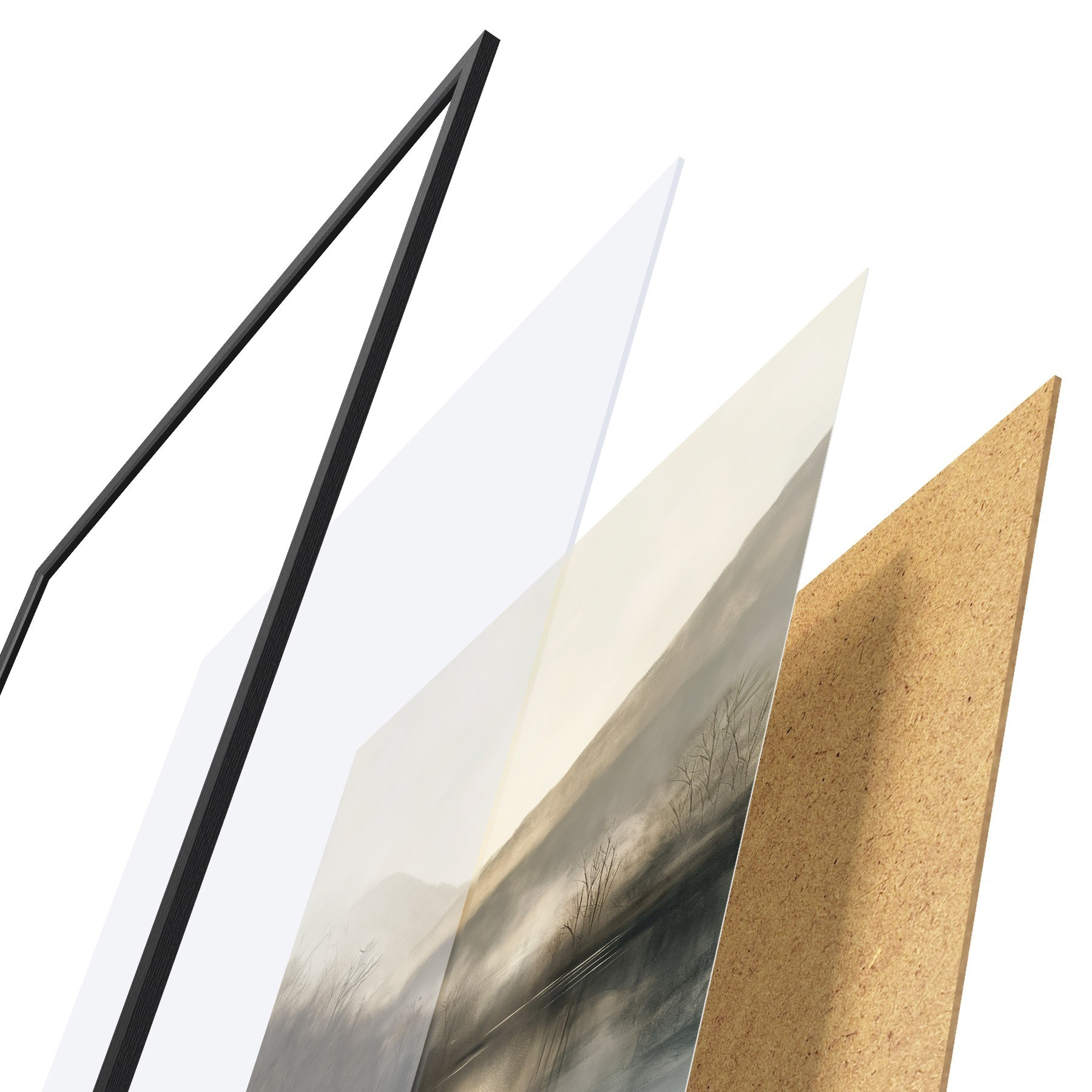 A poszter keretből, plexiből, nyomtatott képből és forgácslap hátlapból áll. A poszter a hátoldalon található rögzítőknek köszönhetően azonnal felakasztható a falra.