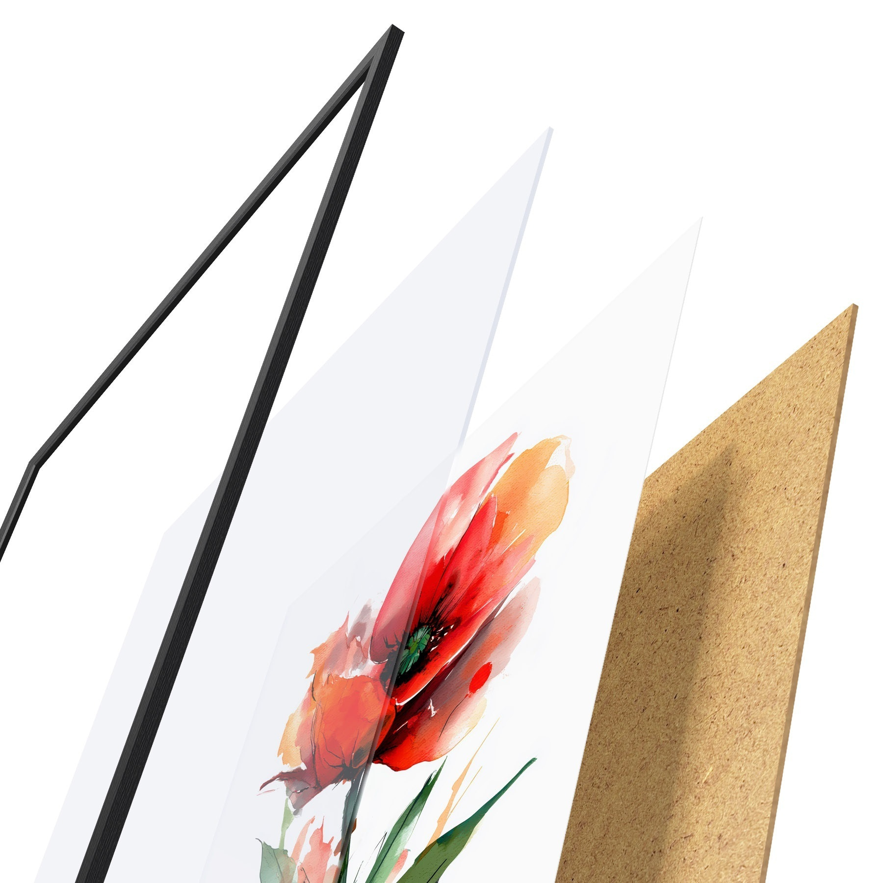 A poszter keretből, plexiből, nyomtatott képből és forgácslap hátlapból áll. A poszter a hátoldalon található rögzítőknek köszönhetően azonnal felakasztható a falra.