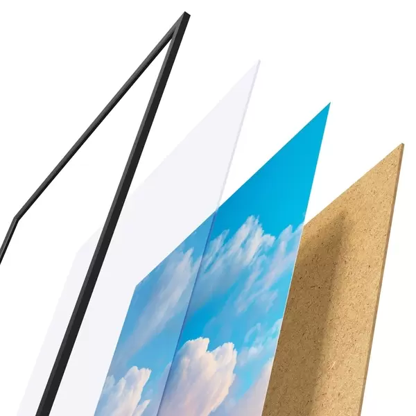 A poszter keretből, plexiből, nyomtatott képből és forgácslap hátlapból áll. A poszter a hátoldalon található rögzítőknek köszönhetően azonnal felakasztható a falra.