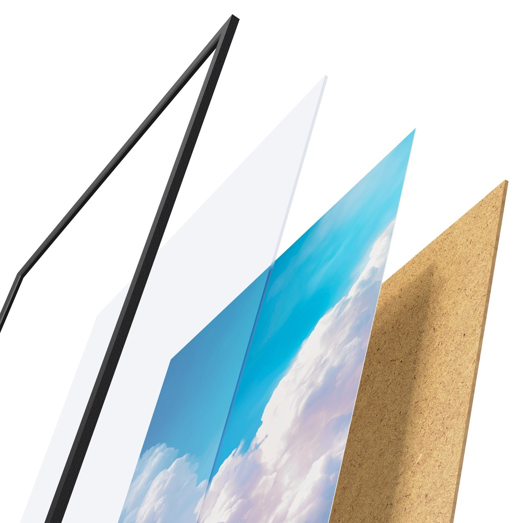 A poszter keretből, plexiből, nyomtatott képből és forgácslap hátlapból áll. A poszter a hátoldalon található rögzítőknek köszönhetően azonnal felakasztható a falra.