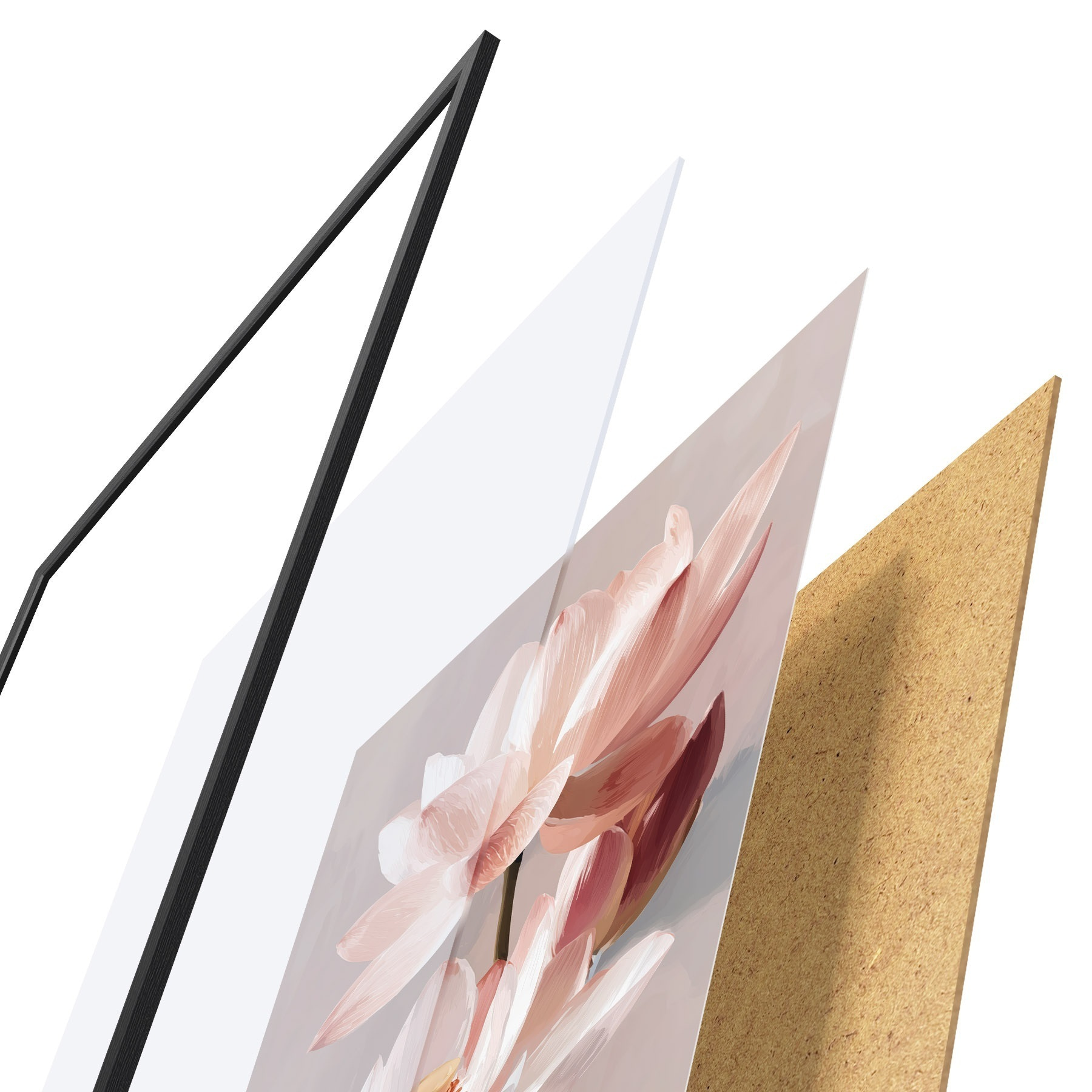 A poszter keretből, plexiből, nyomtatott képből és forgácslap hátlapból áll. A poszter a hátoldalon található rögzítőknek köszönhetően azonnal felakasztható a falra.