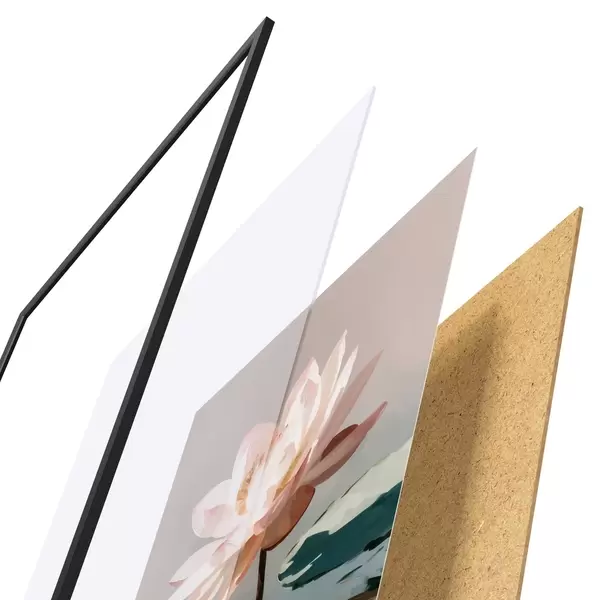 A poszter keretből, plexiből, nyomtatott képből és forgácslap hátlapból áll. A poszter a hátoldalon található rögzítőknek köszönhetően azonnal felakasztható a falra.