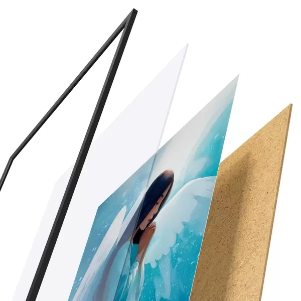 A poszter keretből, plexiből, nyomtatott képből és forgácslap hátlapból áll. A poszter a hátoldalon található rögzítőknek köszönhetően azonnal felakasztható a falra.
