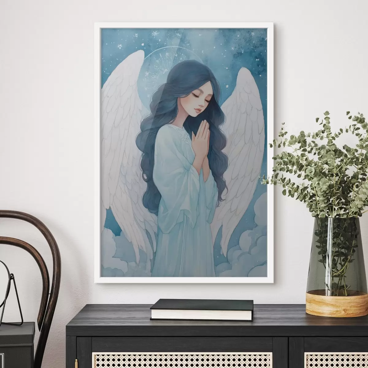 Poster Bájos illusztráció egy angyalról a felhők között, fehér és kék színpalettával Nr f47095