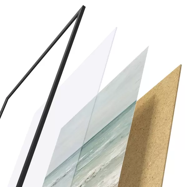 A poszter keretből, plexiből, nyomtatott képből és forgácslap hátlapból áll. A poszter a hátoldalon található rögzítőknek köszönhetően azonnal felakasztható a falra.