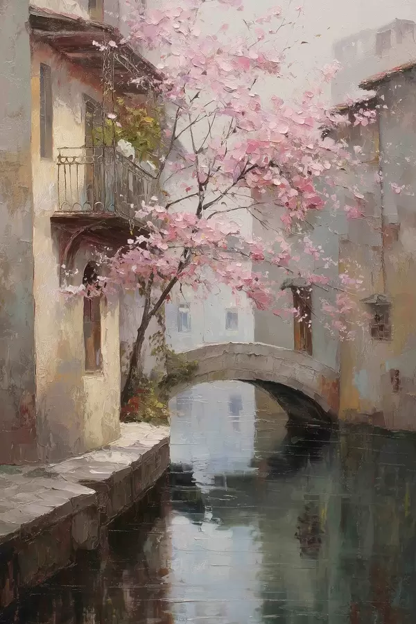 Poster romantikus városi tájkép virágzó fával, olajfestmény stílusban Nr f47126
