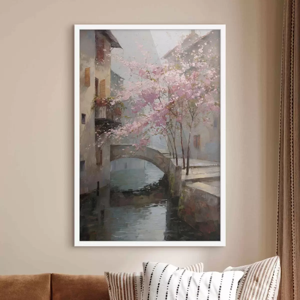 Poster romantikus városi tájkép virágzó fával, olajfestmény stílusban Nr f47127