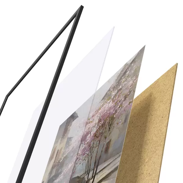 A poszter keretből, plexiből, nyomtatott képből és forgácslap hátlapból áll. A poszter a hátoldalon található rögzítőknek köszönhetően azonnal felakasztható a falra.