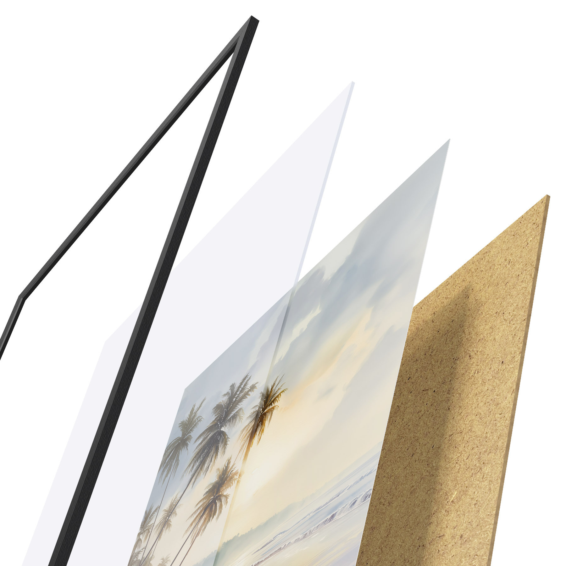 A poszter keretből, plexiből, nyomtatott képből és forgácslap hátlapból áll. A poszter a hátoldalon található rögzítőknek köszönhetően azonnal felakasztható a falra.