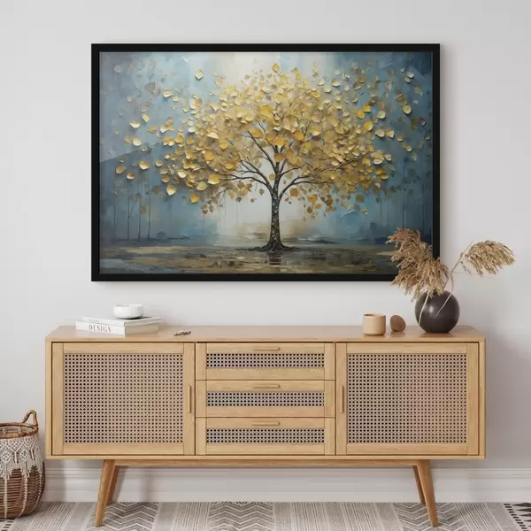 Plakát a sziklán Kék háttér előtt sárga levelű fa f47256