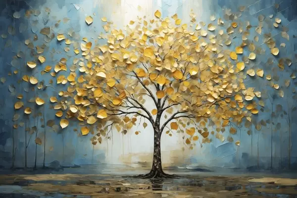 Plakát a sziklán Kék háttér előtt sárga levelű fa f47256