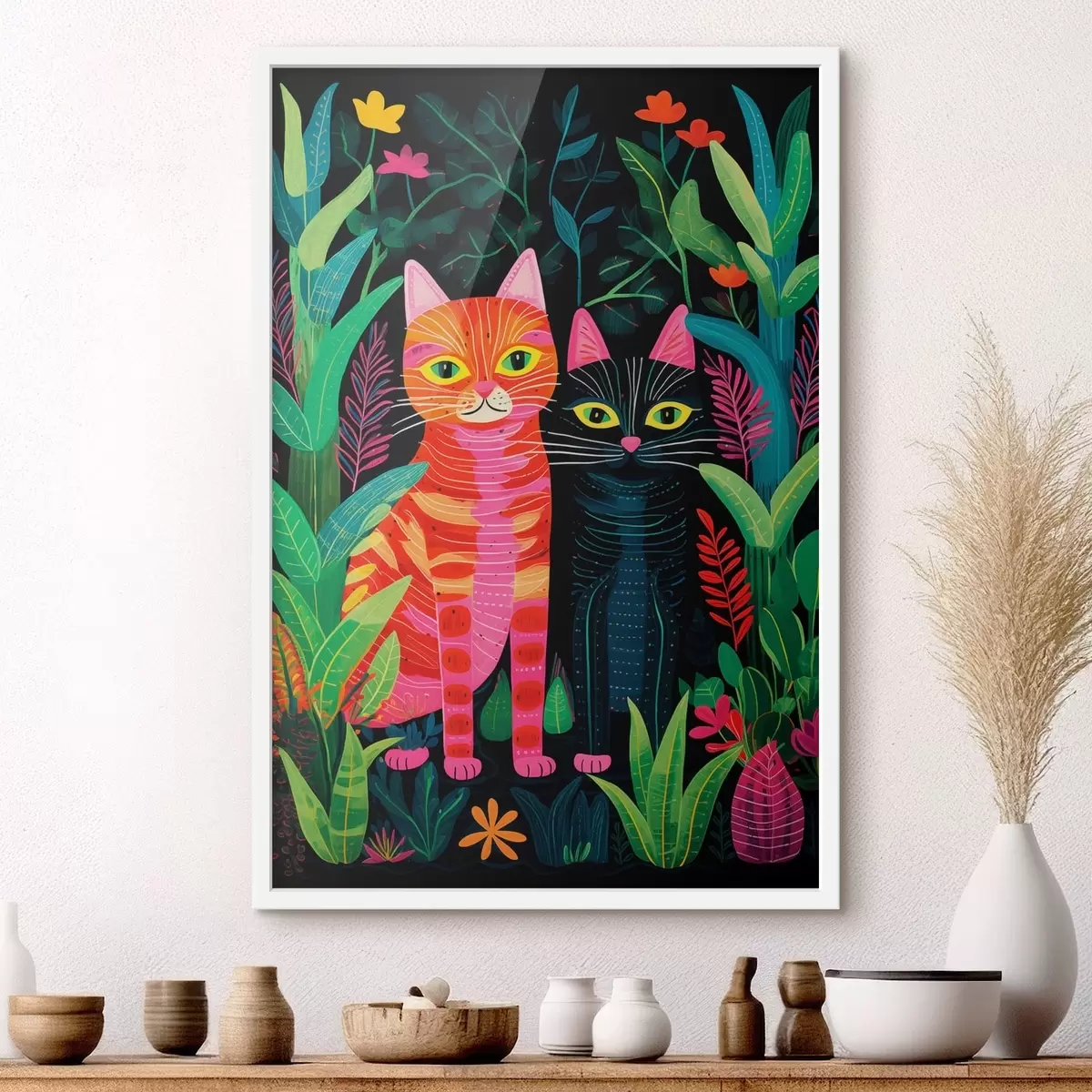 Plakát a sziklán Két stilizált macska élénk növények között f47298
