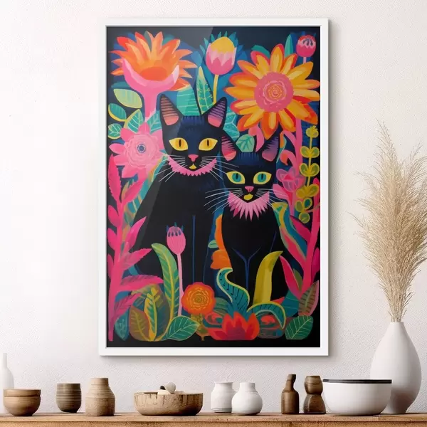 Poster Két fekete macska a ragyogó virágok között Nr f47299
