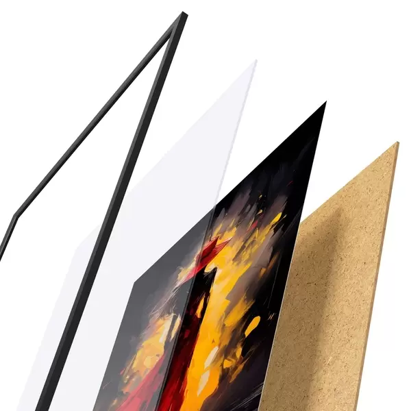 A poszter keretből, plexiből, nyomtatott képből és forgácslap hátlapból áll. A poszter a hátoldalon található rögzítőknek köszönhetően azonnal felakasztható a falra.