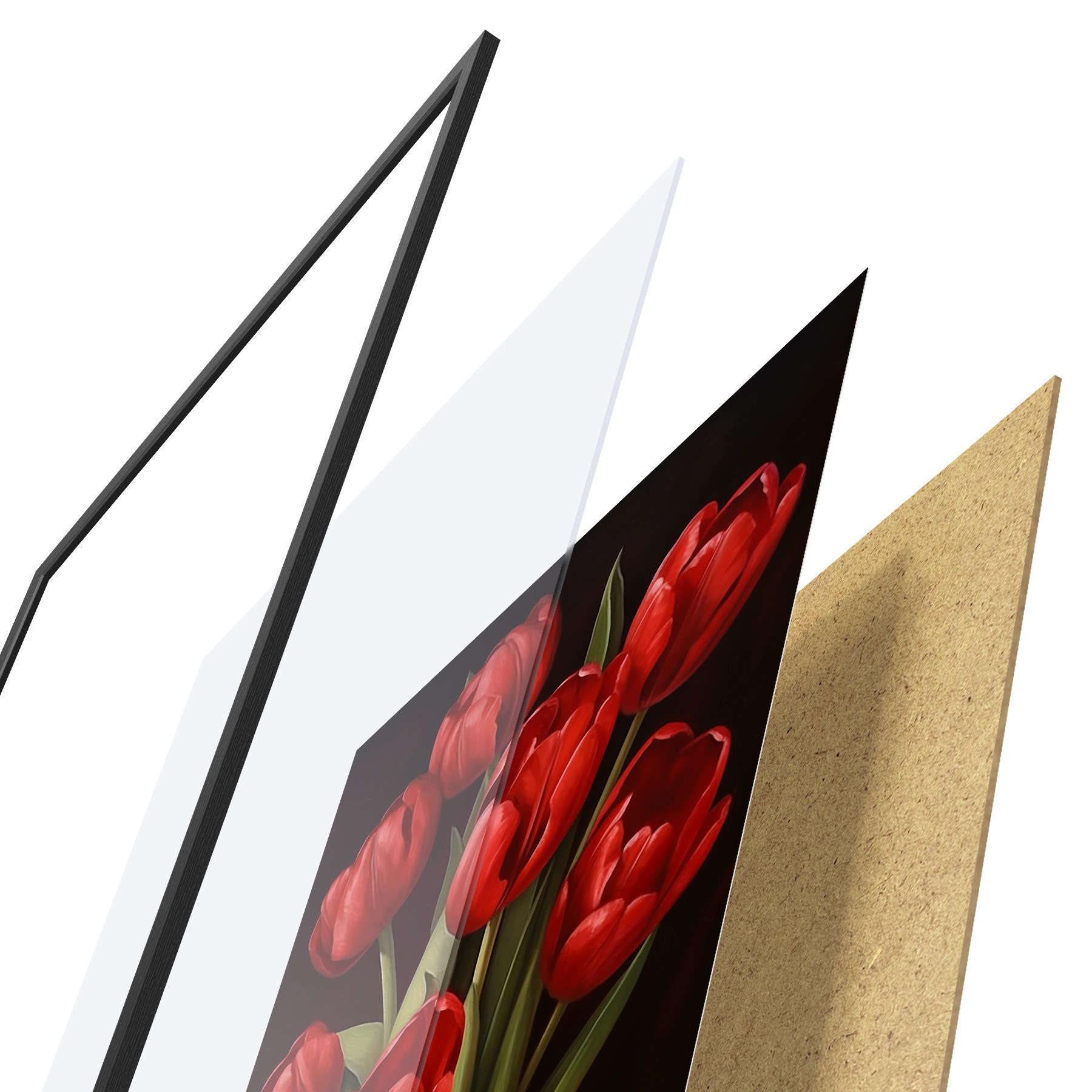 A poszter keretből, plexiből, nyomtatott képből és forgácslap hátlapból áll. A poszter a hátoldalon található rögzítőknek köszönhetően azonnal felakasztható a falra.