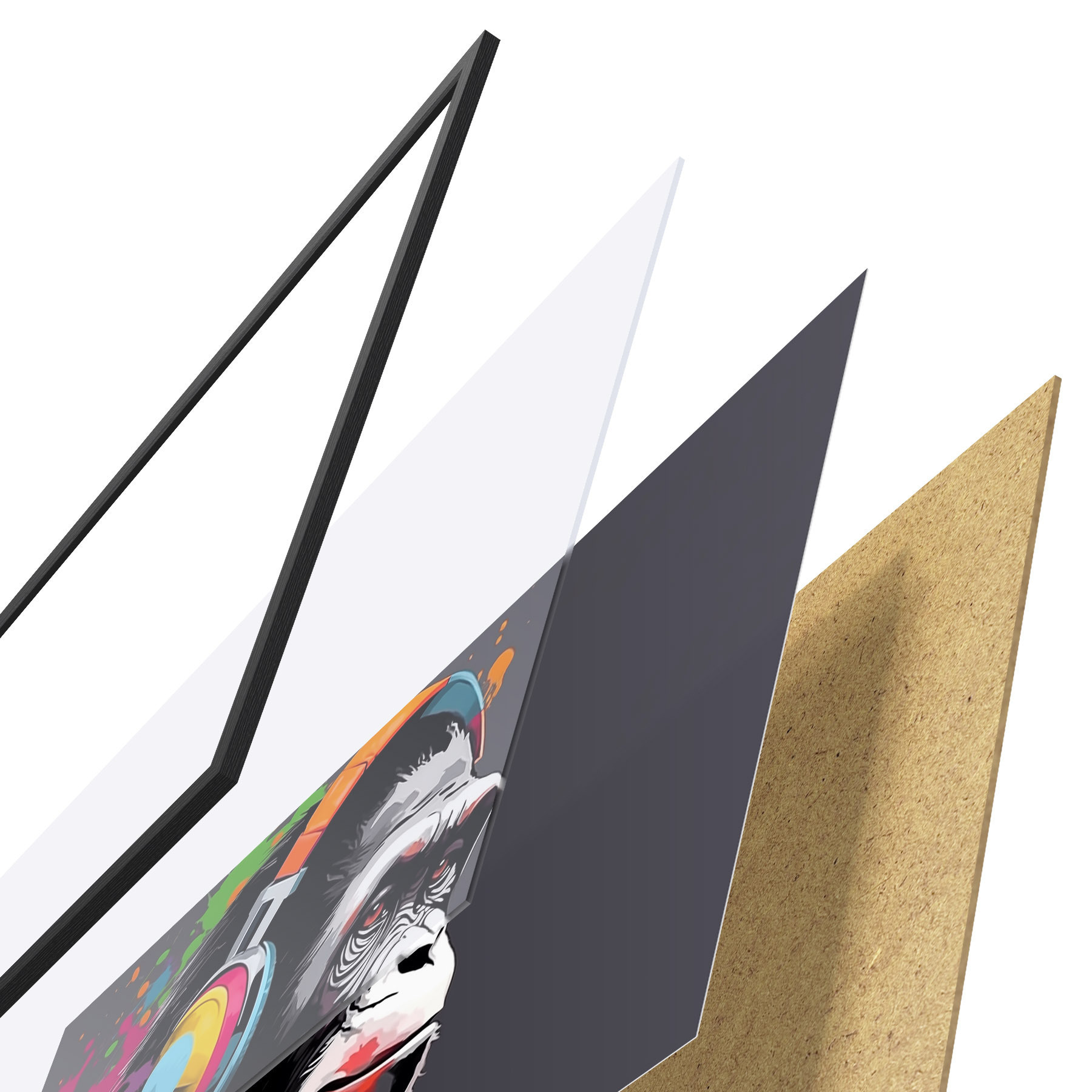 A poszter keretből, plexiből, nyomtatott képből és forgácslap hátlapból áll. A poszter a hátoldalon található rögzítőknek köszönhetően azonnal felakasztható a falra.