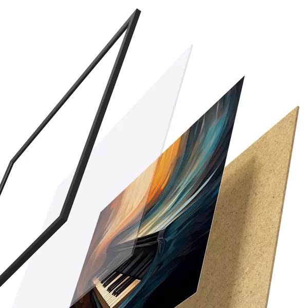 A poszter keretből, plexiből, nyomtatott képből és forgácslap hátlapból áll. A poszter a hátoldalon található rögzítőknek köszönhetően azonnal felakasztható a falra.