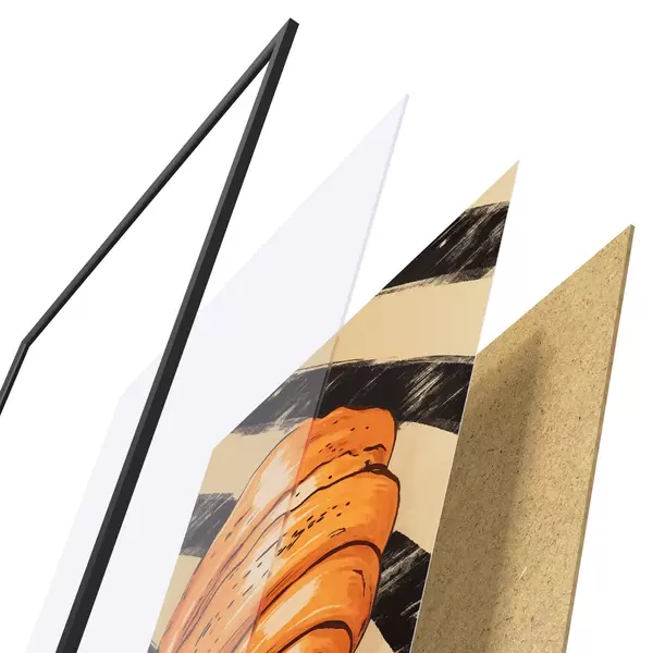 A poszter keretből, plexiből, nyomtatott képből és forgácslap hátlapból áll. A poszter a hátoldalon található rögzítőknek köszönhetően azonnal felakasztható a falra.