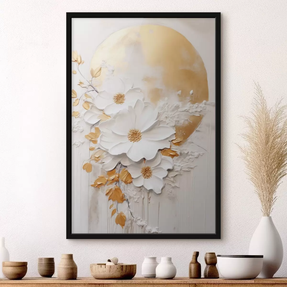 Plakát a sziklán Fehér virágok sárga akcentussal és finom levelekkel texturált háttér előtt, modern művészet f47414
