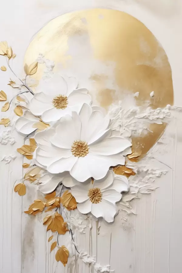 Poster Fehér virágok sárga akcentussal és finom levelekkel texturált háttér előtt, modern művészet Nr f47414