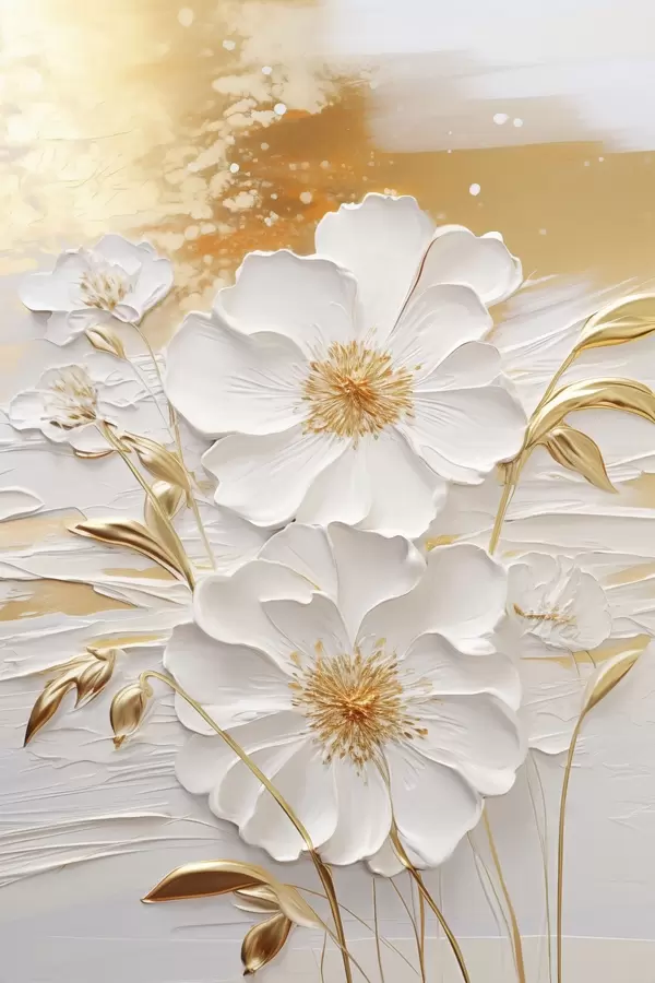 Poster Fehér virágok sárga akcentussal és finom levelekkel texturált háttér előtt, modern művészet Nr f47415