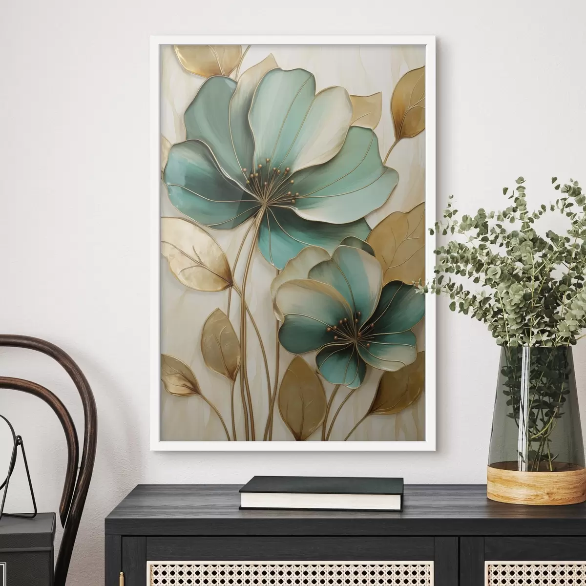 Poster Nagy, kontúrokkal ellátott, kékes-zöld és sárga virágok, sárga levelekkel körülvéve, absztrakt háttér előtt Nr f47418