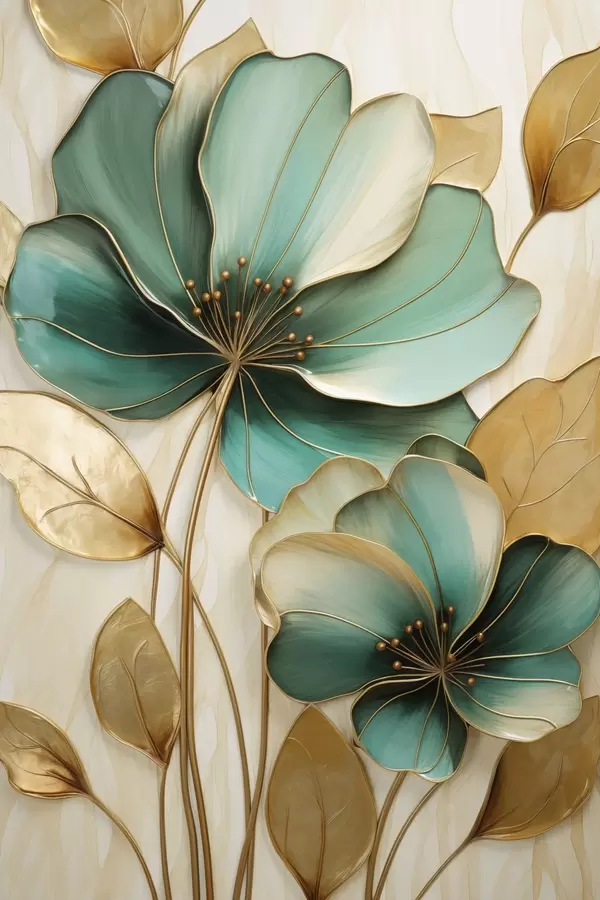 Poster Nagy, kontúrokkal ellátott, kékes-zöld és sárga virágok, sárga levelekkel körülvéve, absztrakt háttér előtt Nr f47418