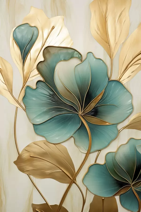 Poster Nagy, kontúrokkal ellátott, kékes-zöld és sárga virágok, sárga levelekkel körülvéve, absztrakt háttér előtt Nr f47419