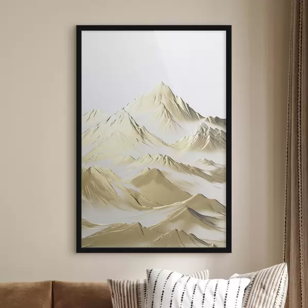 Poster Sárga, hófedte hegyek, éles csúcsokkal és mély völgyekkel, világos ég alatt Nr f47421