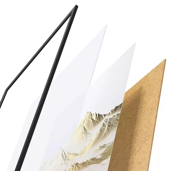 A poszter keretből, plexiből, nyomtatott képből és forgácslap hátlapból áll. A poszter a hátoldalon található rögzítőknek köszönhetően azonnal felakasztható a falra.