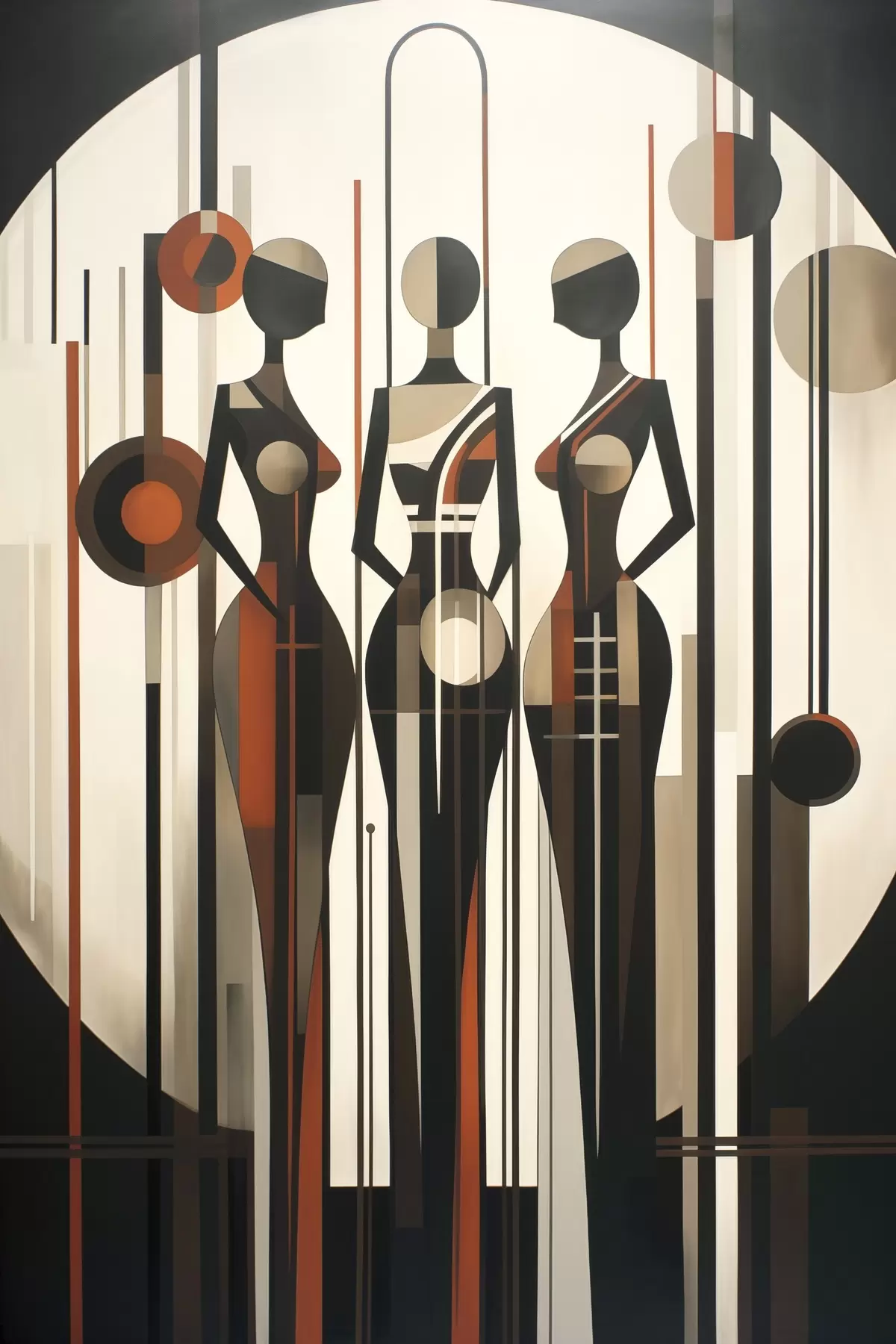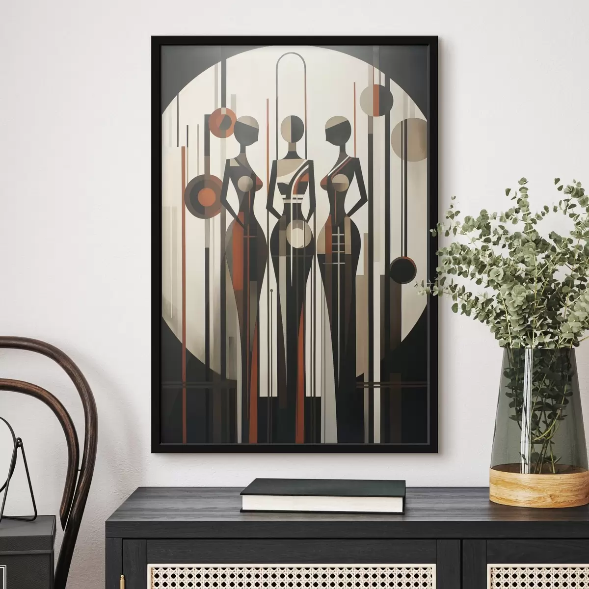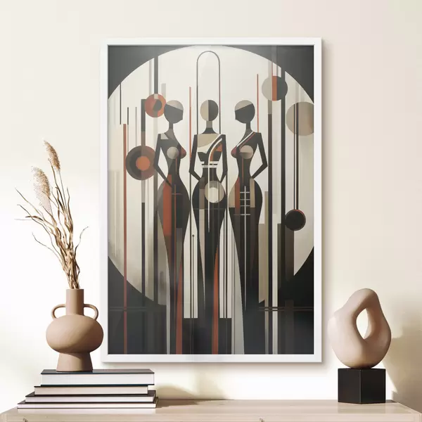 Poster Stilizált női alakok geometrikus elemekkel, függőleges vonalak és körökből álló absztrakt háttér előtt Nr f47422