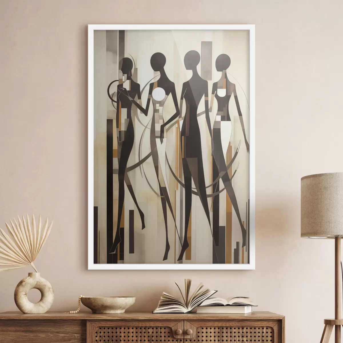 Poster Stilizált női alakok geometrikus elemekkel, függőleges vonalakból álló absztrakt háttér előtt Nr f47423