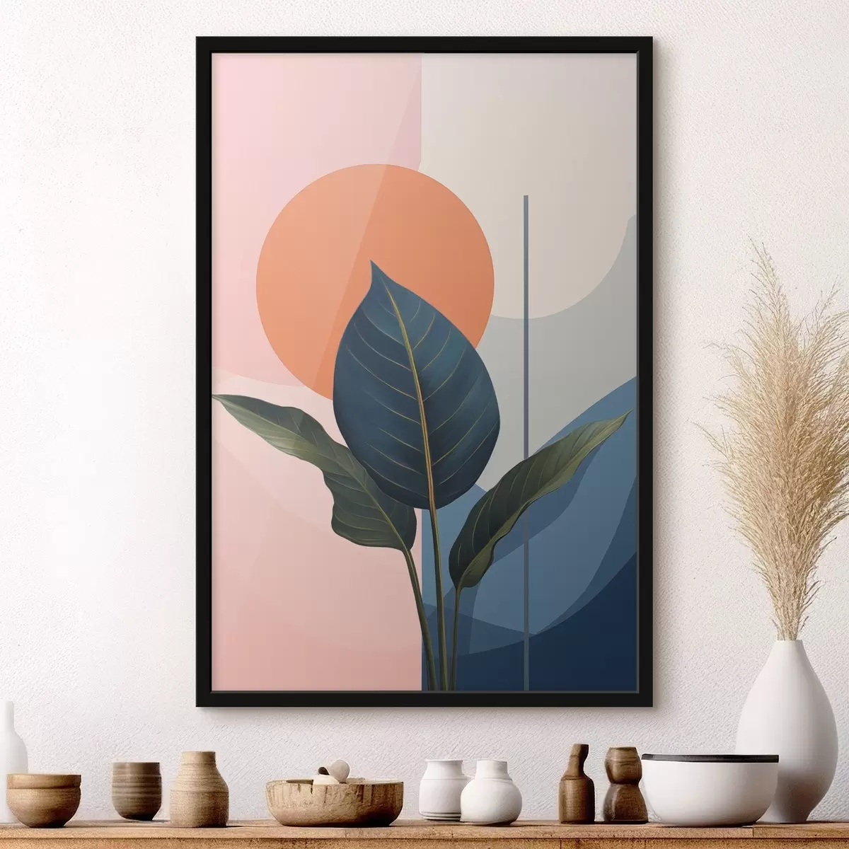 Poster Sötét levelek absztrakt formákkal, barack és szürke háttérrel, narancssárga körrel Nr f47425