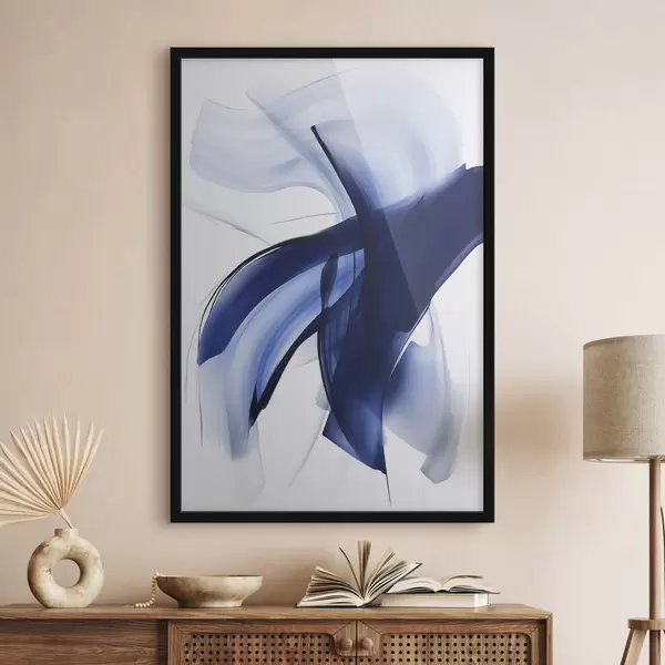 Poster Absztrakt kék ecsetvonás-szerű formák folyékony vonalakkal és görbékkel fehér háttér előtt, modern művészet Nr f47429