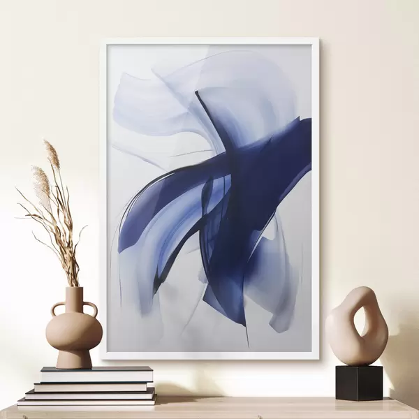 Plakát a sziklán Absztrakt kék ecsetvonás-szerű formák folyékony vonalakkal és görbékkel fehér háttér előtt, modern művészet f47429